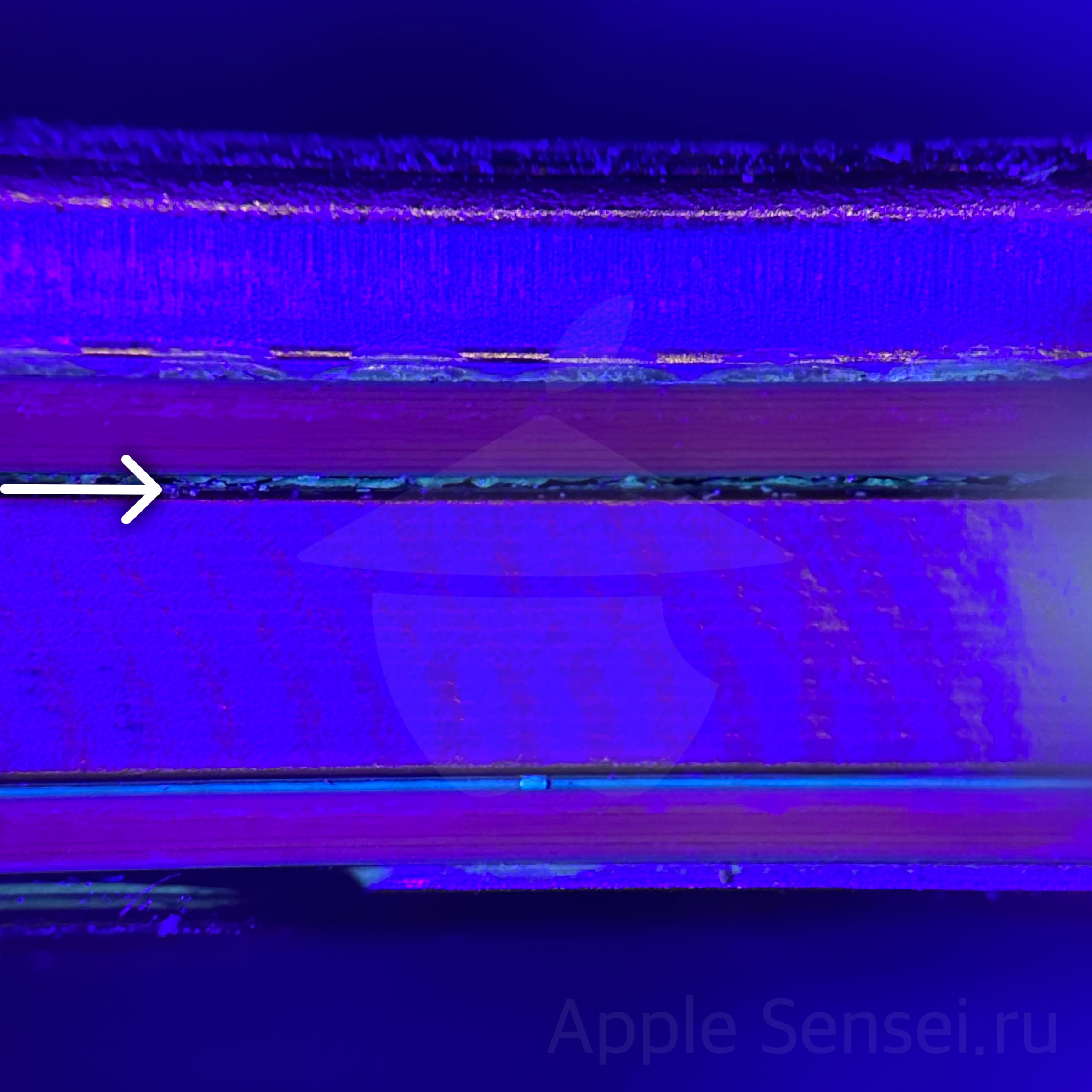 Как и всю 12 серию, вскрываю этот аппарат излишне аккуратно и проверенными методами, чтобы не поймать шальную вертикальную полосу на дисплее. Но в процессе быстро понял, что его уже открывали до меня: телефон вообще не сопротивлялся, ведь дисплейная проклейка почти полностью отсутствует)